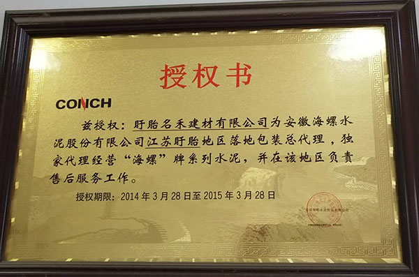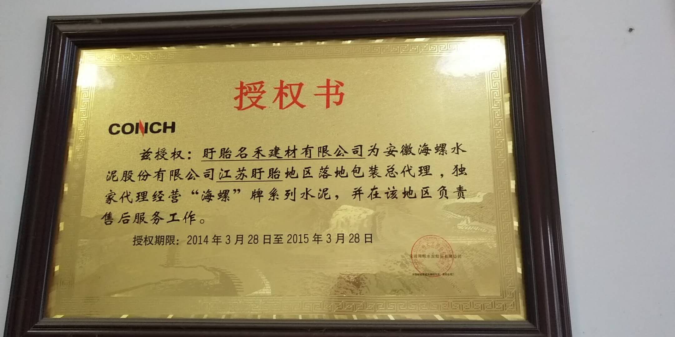 盱眙名禾建材有限公司由安徽海螺水泥股份有限公司授权的在江苏盱眙区域